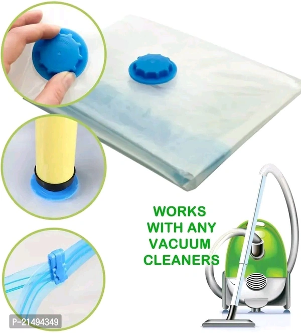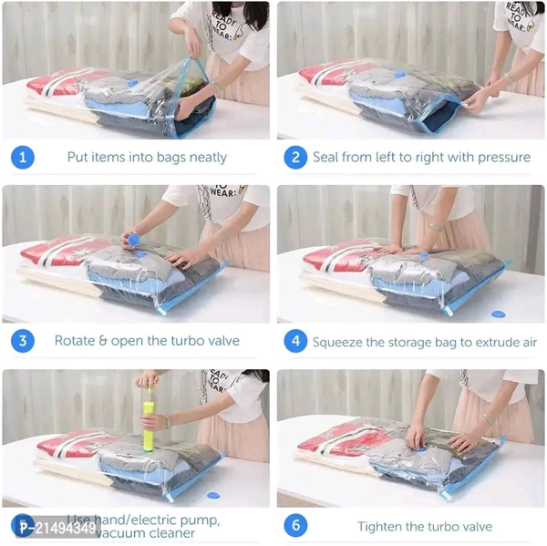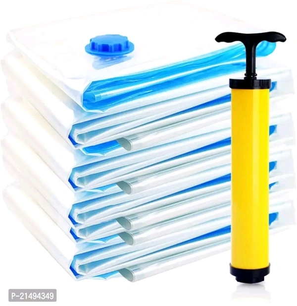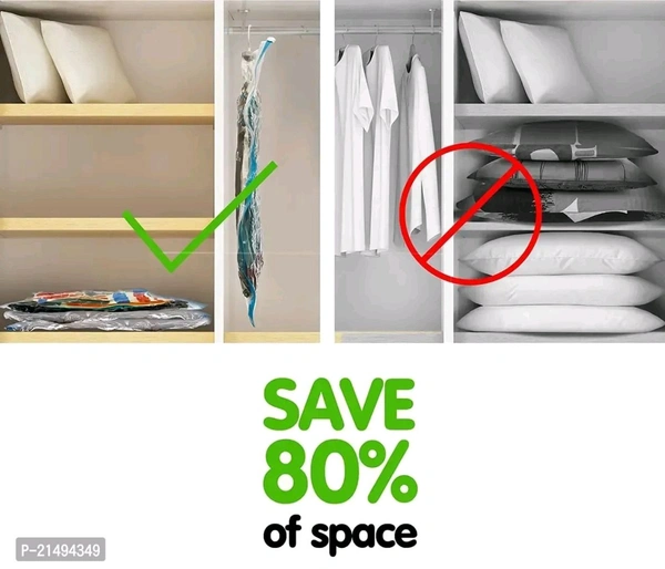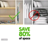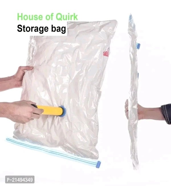 bull; Store Your clothes, comforters, blankets, pillows, quilts or duvets, towels, blankets, woollens and a lot more, like a PRO! This convenient effective storage solution is bound to save upto 80% space, making more room in your life.bull; These compression storage bags suck all the air out and keep it out. No gradual leaking, unsealing or re-inflating. You can rest assured that these bag storage units will keep your items clean, compact and protectedbull; Material Variety: Made of transparent Polyamide Polyethylene to ensure the safety of stored items, the triple-seal formula acts as double security making no air to pass. Designed to be free of any microbial action, blocks odour, water droplets, mildew, insects/bugs. Textured seal to give a non-slip grip.bull; Instead of packing clothes directly in the travel bag, use these vacuum bags and there will be still a lot of space to fit many other things. Avoid using ironed clothes as they tend to wrinkle after the vacuum is applied.Description: - This Sealer Air Bag can be used when you are traveling. It ensures that your clothes don't take so much room in your suitcase. So, don't worry when moving out of the house. - These bags can be invaluable as they can keep your clothes together to ensure none are lost or damaged from the move. Suit for a pillow, quilt, cotton-padded clothes, blanket, sweater, down jacket, and so on. - The Vacuum Storage Space Saver Bags are made using high-quality material, making them tough and durable to ensure more extended usage. The vacuum storage bags are fitted with a heavy-duty valve and double seal zipper that offers airtight safety and prevents the clothes stored in the bag from getting damaged by external factors. - The hand pump allows you to suck out the air from inside the vacuum bag conveniently, helping to eliminate the excess air in the bag while storing away your clothing. Stay organized and effectively store your personal effects for long-term preservation. - Featuring a heavy-duty valve that keeps the bags air tight over time, a thick plastic construction, and a double seal zipper .Use our space saver bags and store away variety size items including bedding clothes, blankets, pillows, plush toys, and more. - What's more: you can use our compression bags to reduce larger and fluffier items such as vests and winter coats to minimal sizes with ease. - Our jumbo vacuum storage bags come in handy for packing hefty items such as big quilts, bedding, or blankets. PACKAGE INCLUDED: 2 PCS (70 x 100 CM) Sized Space Saver Bags with FREE TRAVEL HANDPUMP.